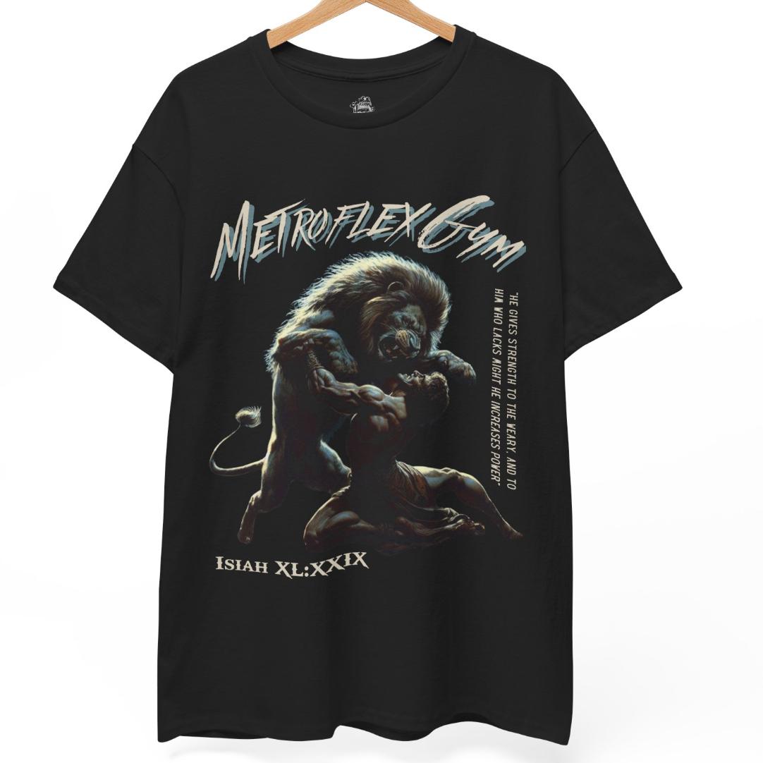 Stand bold in the Metroflex Gym Lion Strength Tee, a powerful symbol of grit, faith, and determination. Featuring a striking graphic of a lion locked in battle, this design represents strength through struggle and victory through perseverance.